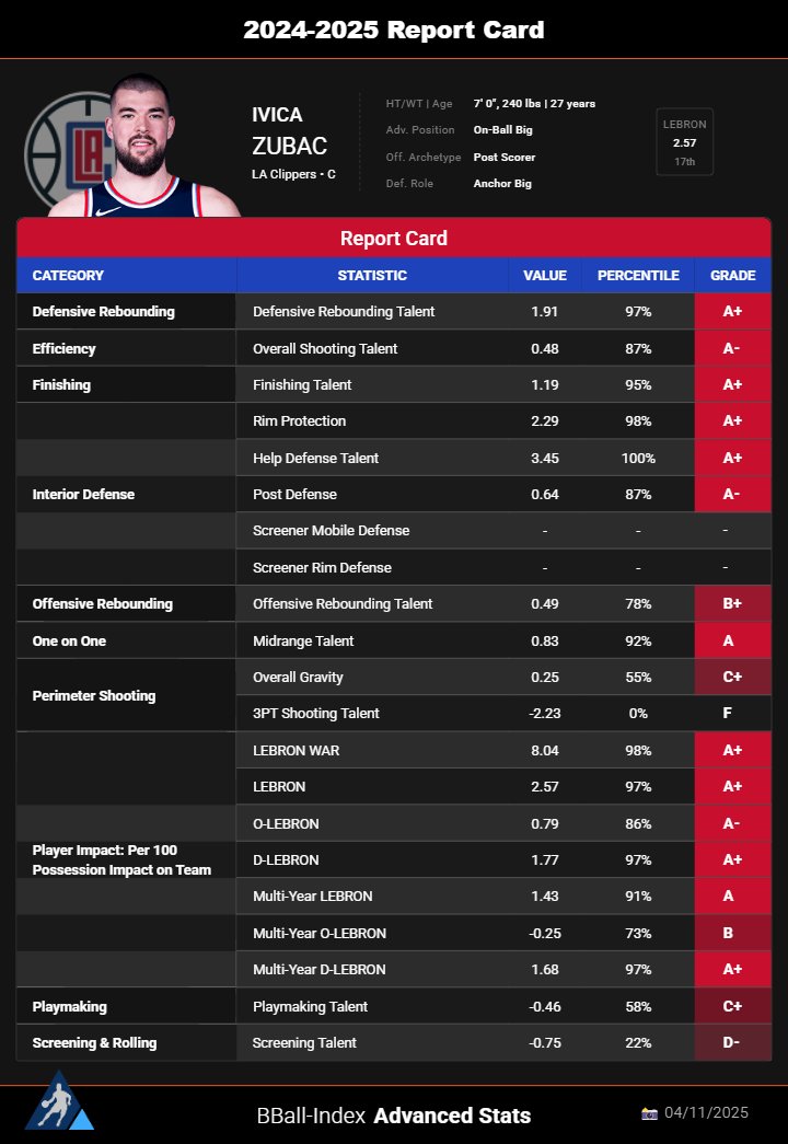 Literally not one of those players is a more impactful defender than Zubac outside of Gobert, nice try though. And the 3-4 prior years only Bam and Gobert were ever better defenders in this list.