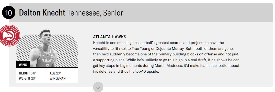 The question now for scouts is basically one of “How high?” in terms of where Knecht’s shooting skill will put him in the NBA next year, but teams will be watching his lateral movement closely to see how well he can hold up as a wing defender. As an older player who will be 23 on draft night, Knecht also will be evaluated through the lens of being four years older than most of the players who will go in the top 20.